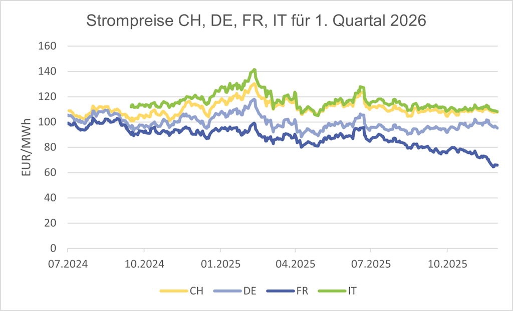 In der Schweiz sind die Preise im Vergleich zur Vorwoche gesunken. Das Schweizer Kalenderjahr 2026 handelte 1% tiefer bei 89 EUR/MWh. Der Preis für die Stromlieferung im ersten Quartal 2026 blieb unverändert bei 108 EUR/MWh.