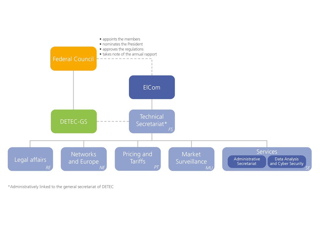 ElCom is made up of five to seven independent members appointed by the Federal Council, plus a Technical Secretariat. ElCom is not subject to any directives of the Federal Council and is independent of the administrative authorities.